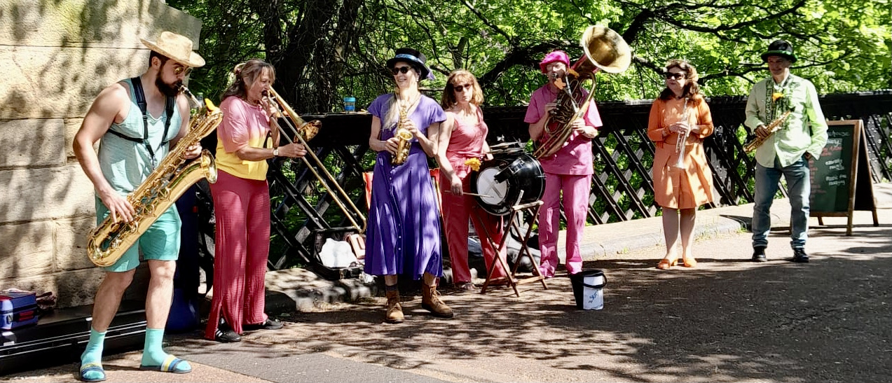 In lockdown, the same musical partnership as Little Big Blue got together as a streetband trio, playing horns, to accompany storyteller Chris Bostock’s ‘Stories 2m Apart’ after school on Fridays. Children from Jesmond Vale ‘Minories’ gathered on The Green and listened to stories and music. When Jesmond Food Market restarted in late 2021 they expanded the group with musician friends playing on the 1st and 3rd Saturday of the month. In 2022 they played a number of festivals and Ken wrote and produced a Mummers play for winter for the band. They adopted a ceilidh format with theatre between social dances playing self penned tunes with a streetband line-up. They continue to grow and develop their festival circuit. Website
