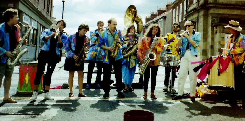 Ken helped run the Linden Folk Club with Rod Clements of Lindisfarne and Geoff Heslpo of Black Crow Records. The venue was near Ken’s tea room in Rothbury, started in the early ’80s where he met many folk notables: e.g. Bert Jansch and Ralph McTell, but he only started to get back to playing music again was on becoming a primary school teacher. It turned out that his ability to play the piano and lead music was to be important again, in this particular newly chosen career. On a ‘drama in the classroom course’ he met Ozzie and Elaine from Dodgy Clutch theatre company who had, in turn, been heavily influenced by the work of Welfare State International. Soon after ‘The Pineapples’ (to become Pineapple Agogo) was formed. A streetband with horns/sax/percussion line-up (Ken on trombone) formed to animate celebrations in communities. The band could metamorphose into a ceilidh band with fiddle, accordion, drum kit, bass guitar (Ken), and a horn section. They played at numerous Fish Quay Festivals in the late ’80s and the National Streetband Festival in 1990, the event organised by Ken with the Gateshead Arts and Libraries outreach team. They also were a regular band for weddings, notably at Wilton Castle in Teeside. They wound down in the early ’90s as a number of the members moved on to other places. HEAR Pineapple Agogo playing Ken’s Fishquay Festival Theme