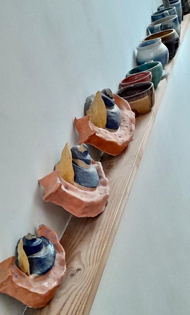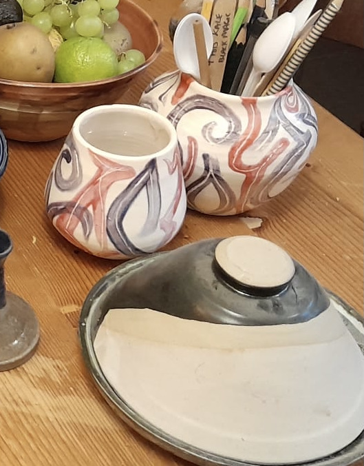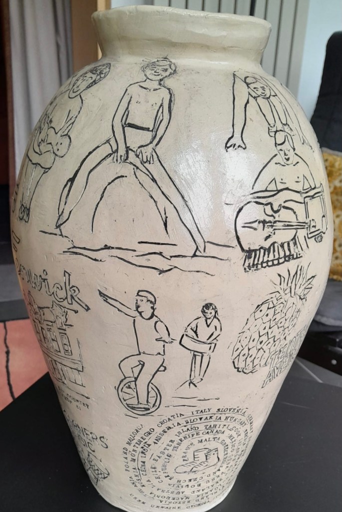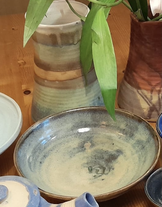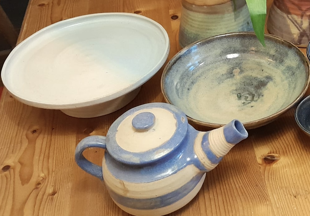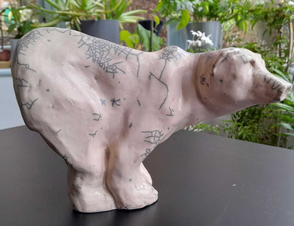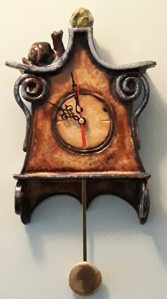 Starting in 2010, Ken has attended weekly sessions at the Cluny Pottery in Byker, Newcastle upon Tyne, mentored by David Pyrke. A selection of large coiled pots: ‘The Pot of Basil’, and the ‘Life Pot’ have been created. Many household pots thrown on the wheel: ‘Blue RARE Goblet’, teal pots, bowls , plates, cheese domes and caked stands. Cast pots from Ken’s original ‘Snow Bear’ sculpture then raku fired. And a slab pot in the form of a clock.
