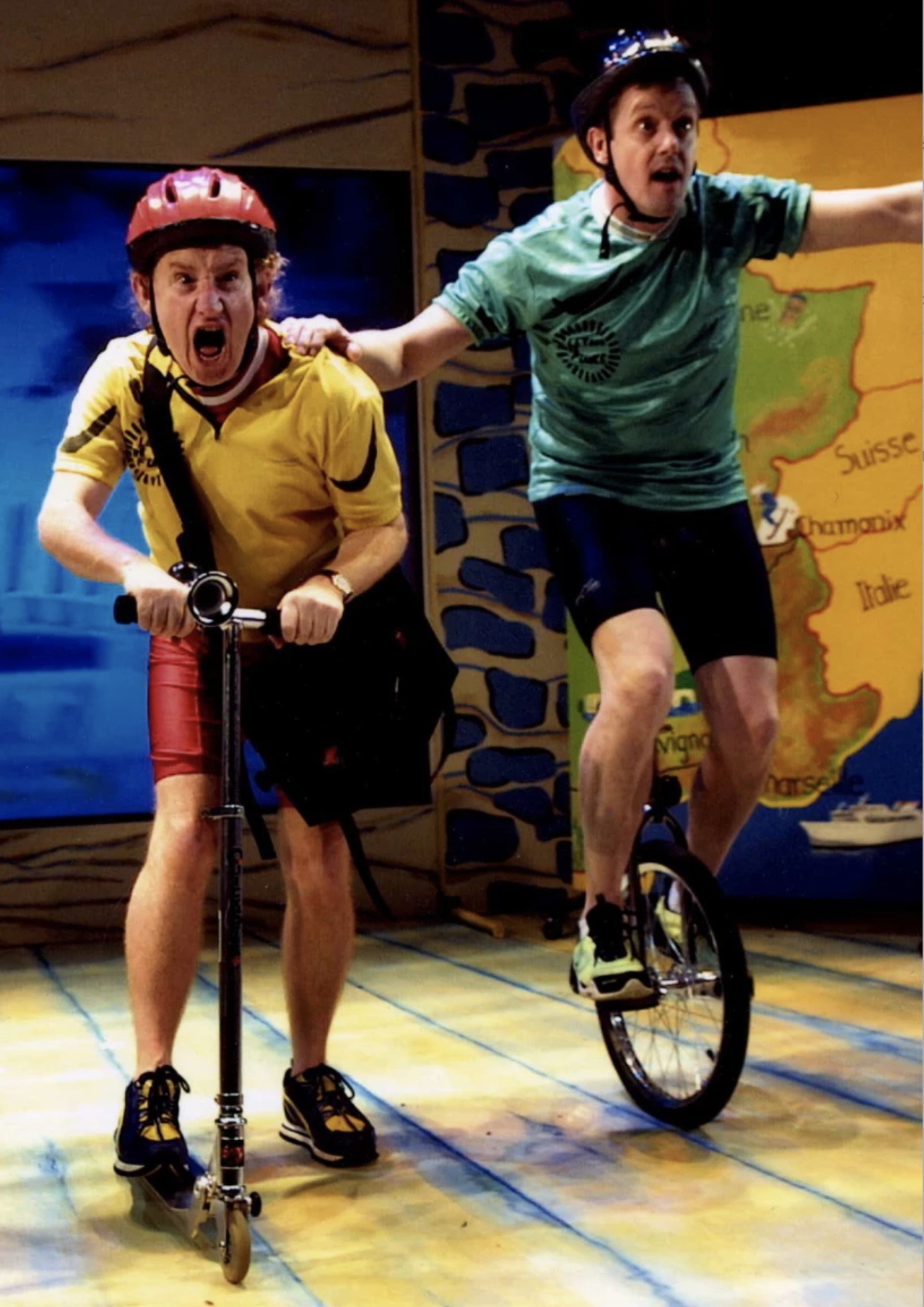 A chase across France to hunt down Le Fantôme Cycliste, exploring its language and culture through a thrilling and fast-paced adventure story about the world’s greatest cycle race. Ken: ‘We filmed action in France in Paris, Noyon, La Rochelle, on the slopes of Chamonix, in a chateau in Fontainebleau, and in Villejesus. I got to unicycle up to the Notre Dame Cathedral. We wore the same costumes on stage and combined live and large screen video action to tell the narrative. We added extra film for a digital classroom resource returning after fifteen years to the same locations. All except the Chamonix scenes which was shot above Ireshopeburn in Weardale in snow. I wore a singlet and cycle shorts for hours in the freezing cold’.